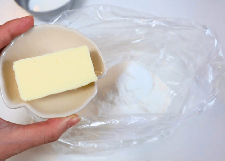 筆者はバターを冷蔵庫から出したばかりで混ぜ合わせてしまったので最初は少しかたかったのですが、手で温めるようにこすり合わせていくとなじみやすかったです!