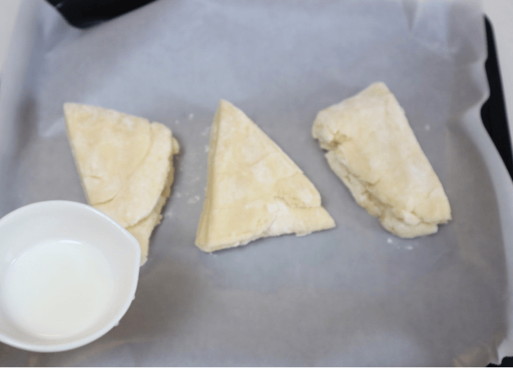 天板にクッキングシートをのせて生地を並べたら、表面に適量の牛乳を刷毛を使ってぬりましょう!
