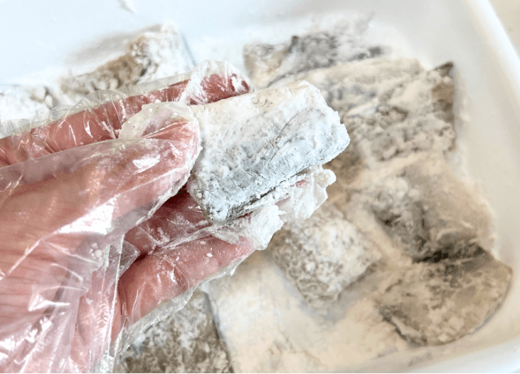 キッチンペーパーで軽く水気を取ったら、片栗粉をまぶします。