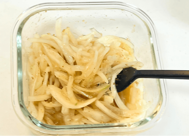 スライスした玉ねぎを水にさらし、辛みを抜いてから水気をしっかり切ります。