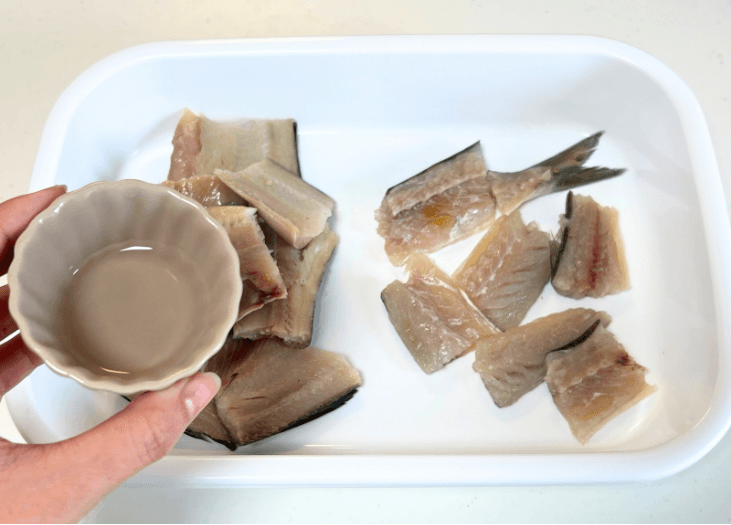 カットした干物に酒をサッとまぶし、表面の臭みを取りましょう。