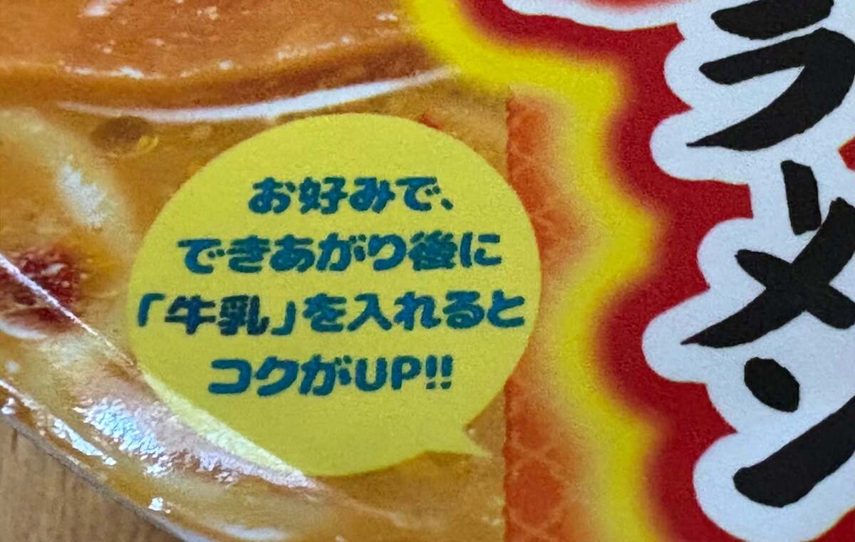カップラーメンのフタにできあがり後「牛乳」を入れるとコクがupと記載してあったのでお湯を少なめにして牛乳を温めて入れました。