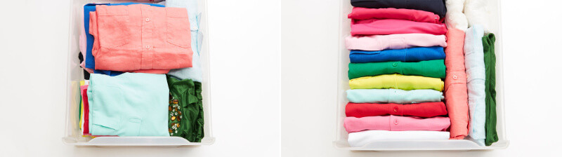 写真左のように衣類を重ねるよりも、右のように立てて並べる収納の方が、衣類に重みがかからないのでしわが付きにくく、型くずれも防止できます。すべてのアイテムが一目で見渡せ、取り出しやすいのもポイントです。
