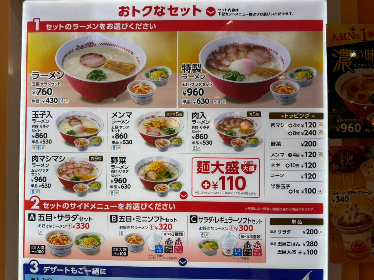 スガキヤの看板は、和風だしを効かせた独自の「和風とんこつスープ」。とんこつというと濃厚でこってりした味を想像しますが、スガキヤは不思議なくらいあっさり。食べやすさとクセになる風味が特徴です。