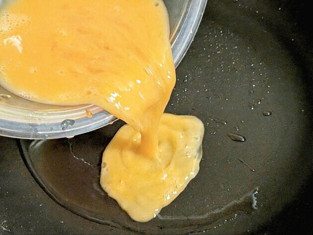 フライパンにサラダ油を入れて中火で熱し、溶き卵を入れてください。さっと炒めて半熟状になったところに、ごはんを加えて炒めます。