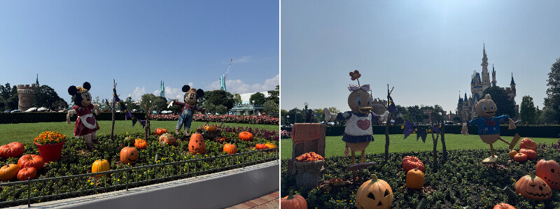 さらに、周りの花壇にはたくさんのカボチャと、ミッキー・ミニー、ドナルド・デイジーに扮したカカシが!