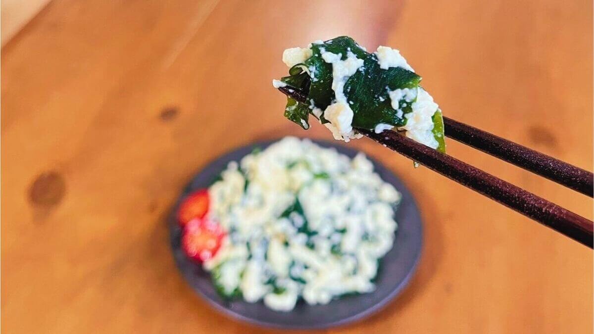 ワカメが全体にいきわたるよう意識しながら、豆腐を細かく潰します。