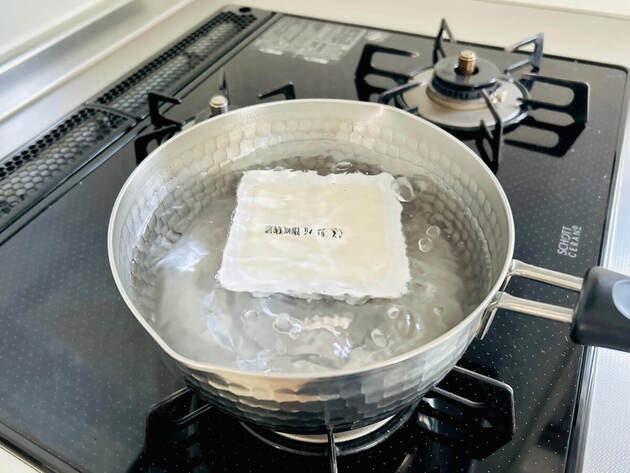 ※充填豆腐は、製造過程でパックごと加熱処理をおこなうので、パックに耐熱性があります。そのため、今回のように沸騰したお湯にパックごと入れることが可能。木綿豆腐や絹ごし豆腐のパックではこの裏ワザはできないのでご注意ください。