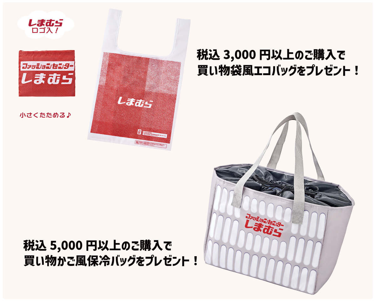 POP UP STOREで税込3,000円以上お買い上げのお客様に、「しまむら買い物袋風エコバッグ」が、税込5,000円以上お買い上げのお客様に「しまむら買い物かご風保冷バッグ」がプレゼントされます。