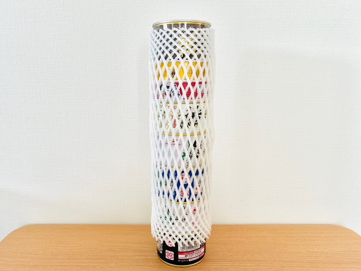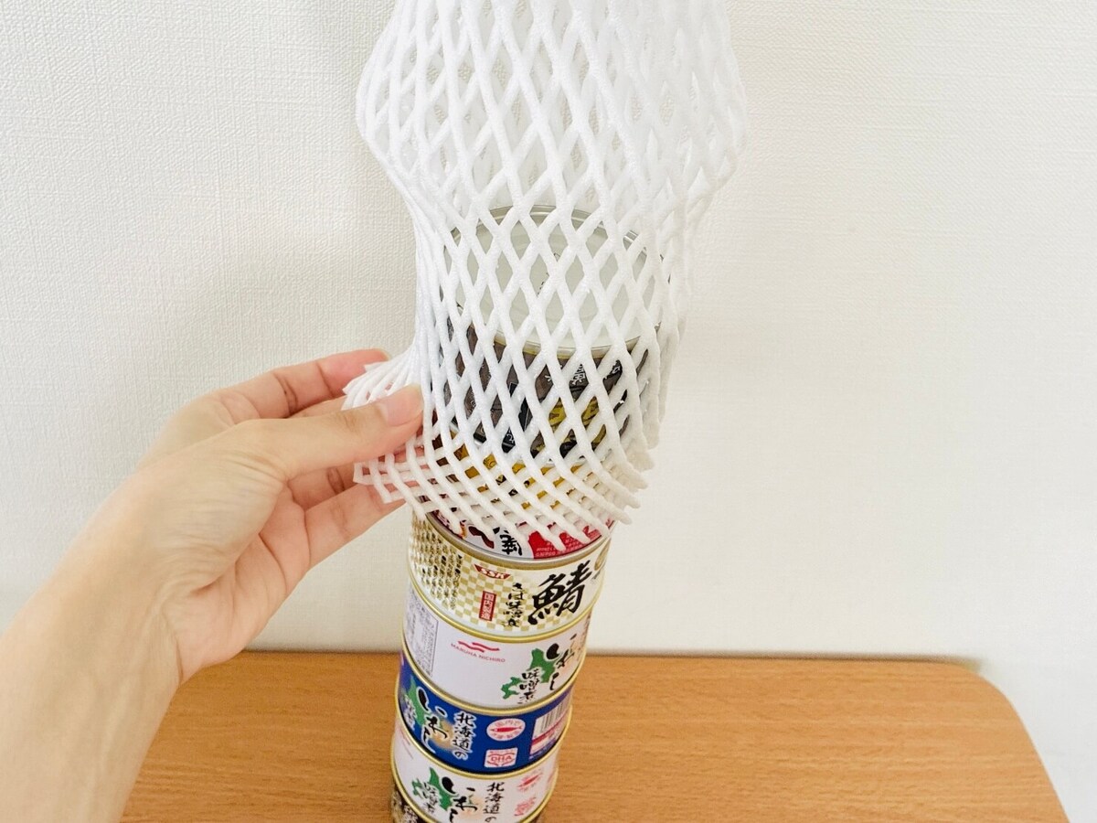 そして、缶詰タワーの上から被せちゃいます。