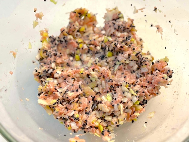 ロースハム、長ねぎ、キャベツ、黒いりごまを加えて混ぜたら、10等分にします。