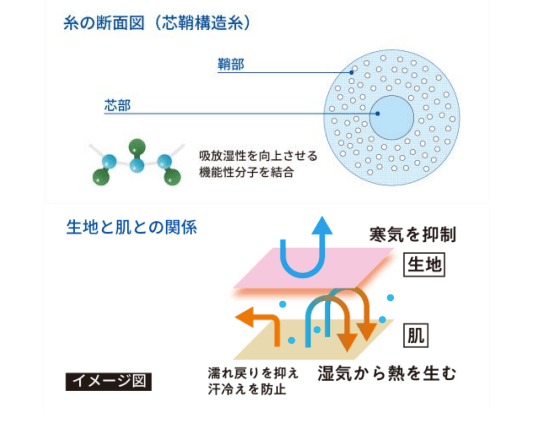 糸の芯部に、従来と比べより高い吸放湿性を発揮する分子を結合し、衣服内の湿気を吸放湿します。