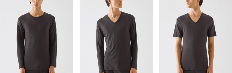 左から、長袖クルーネック、長袖Vネック、VネックTシャツ