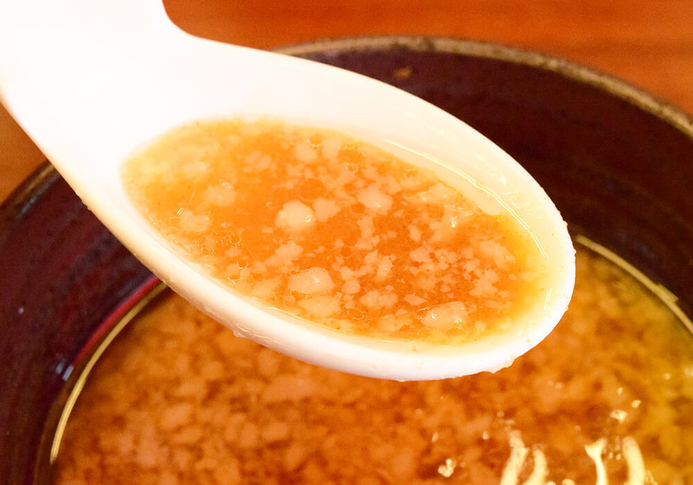 生姜は上記写真の赤丸で囲った程度の入り方ですが、それでも充分生姜が強く、しっかりと生姜がきいていますよ。並盛でもお腹いっぱいになりますし、そこそこガッツリ系のつけ麺を求めている人におすすめの一杯です。