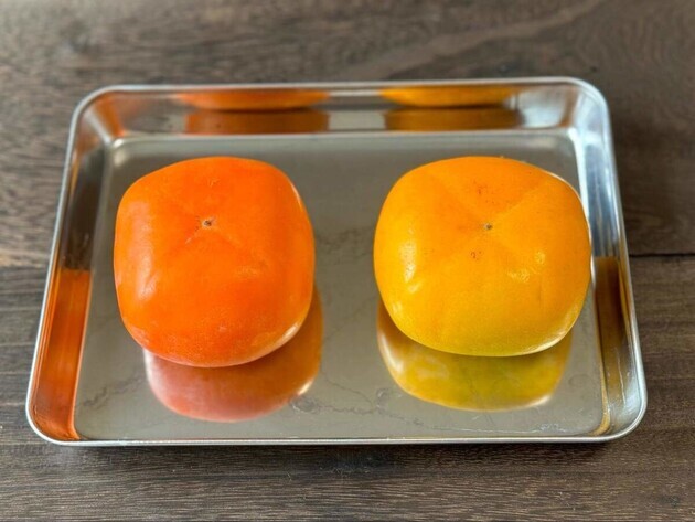 糖度計がないので私の味覚頼りで判断すると、右の柿に対して左の柿は糖度2.5倍!