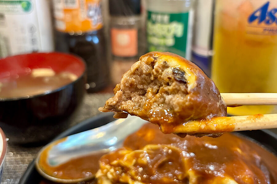 お肉だけかと思ったら、デミグラスソースの下には、チーズと目玉焼きが隠れてました。これは嬉しい誤算。肉だけでも美味しいのにさらに美味しさがUPします。