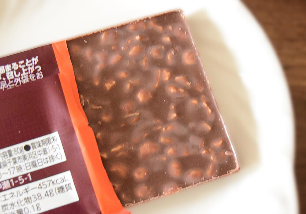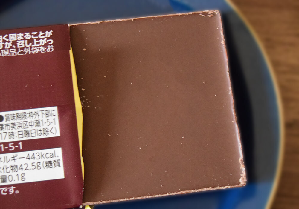 まずは「プレーン」から実食。チョコレート表面に不規則な凹凸があるのですが、手でも切りやすいので助かります。