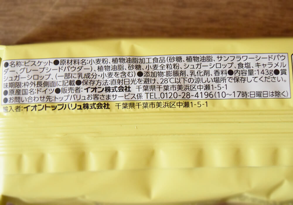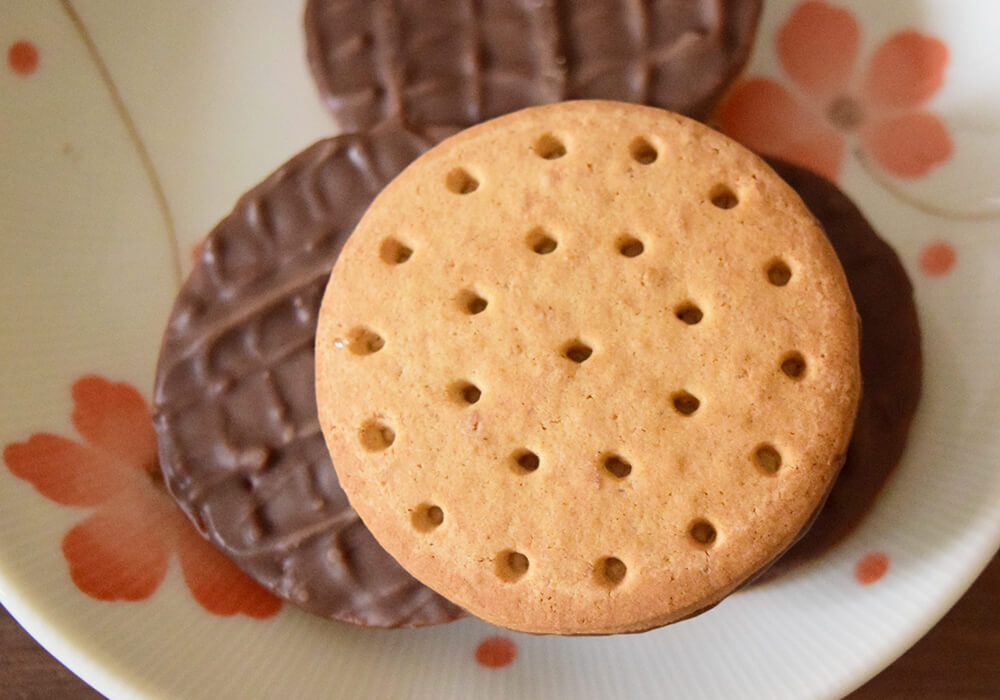 小麦全粒粉入りで固めのビスケット生地の片面にチョコレート代用品がコーティングされています。見た目は普通のビスケット。