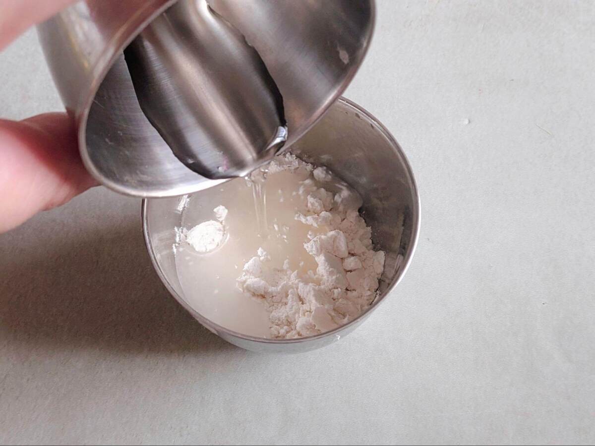 小麦粉と水を混ぜて、春巻きの皮をくっつけるための 【のり】を作りましょう。