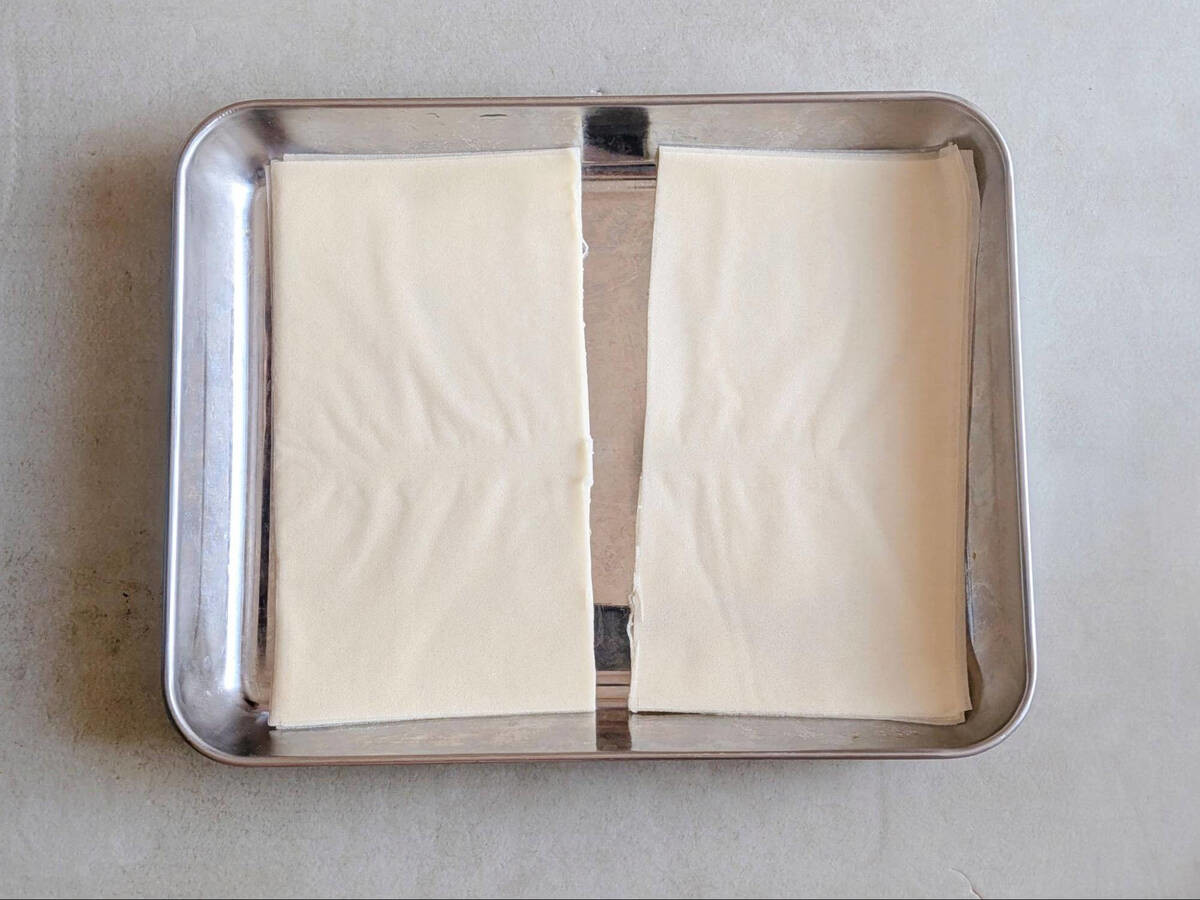 皮の3辺にのりをつけて、空気を抜くように巻きましょう。