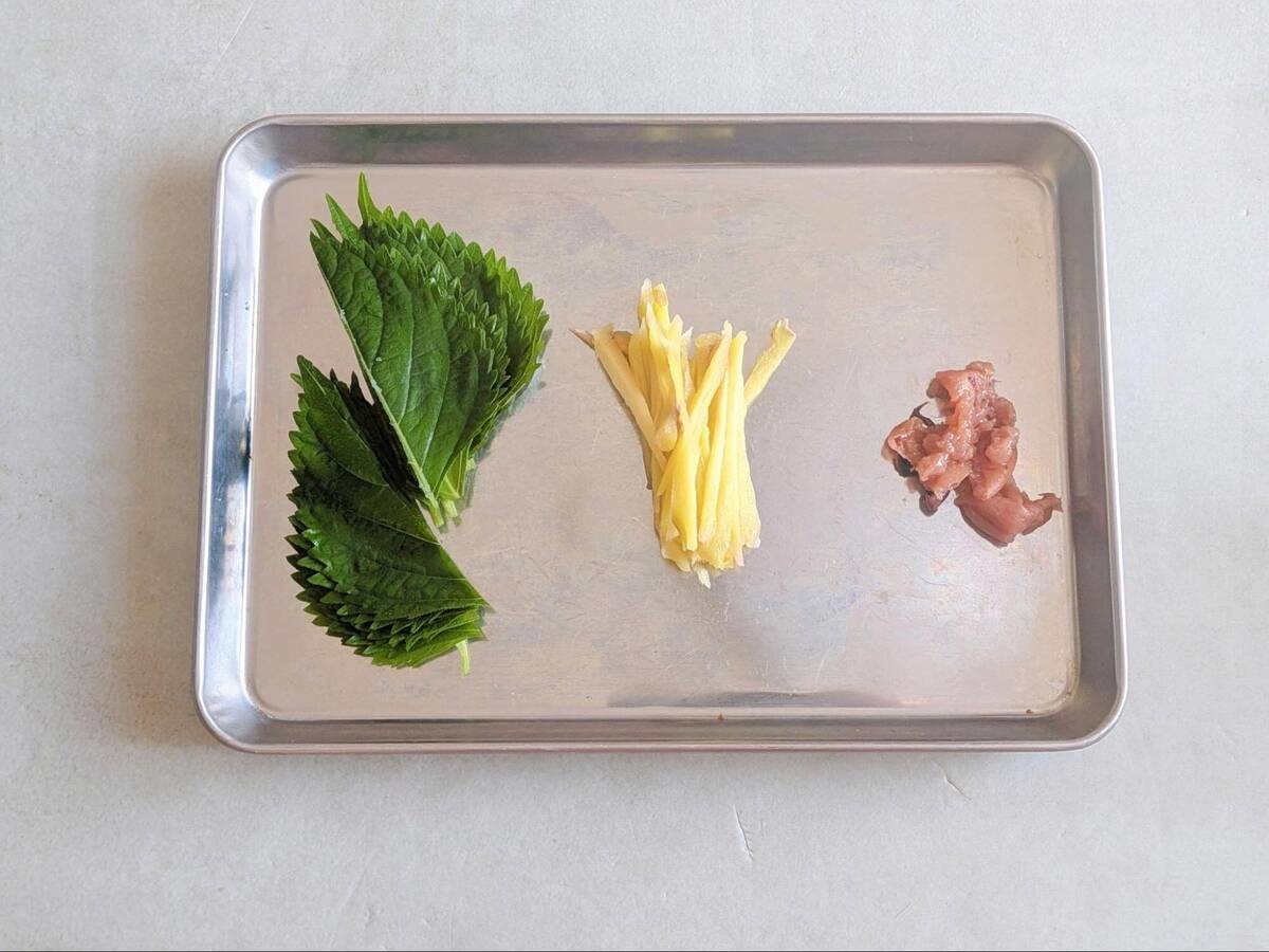 青じそは縦半分に、しょうがはせん切りに、梅干しは適当な大きさにちぎり種を取り除きます。