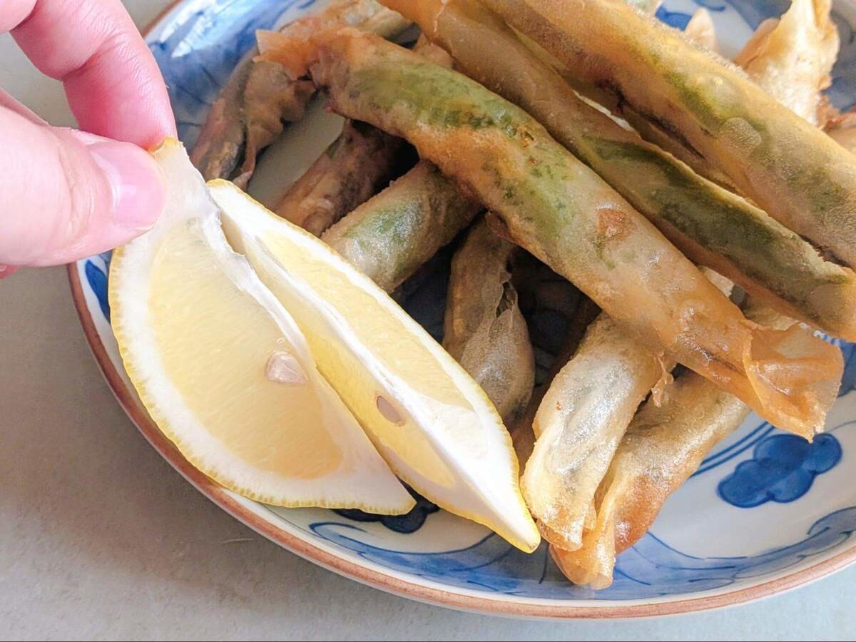 ④を器に盛り、塩とレモンを添えたらできあがり。揚げたてをいただきましょう!