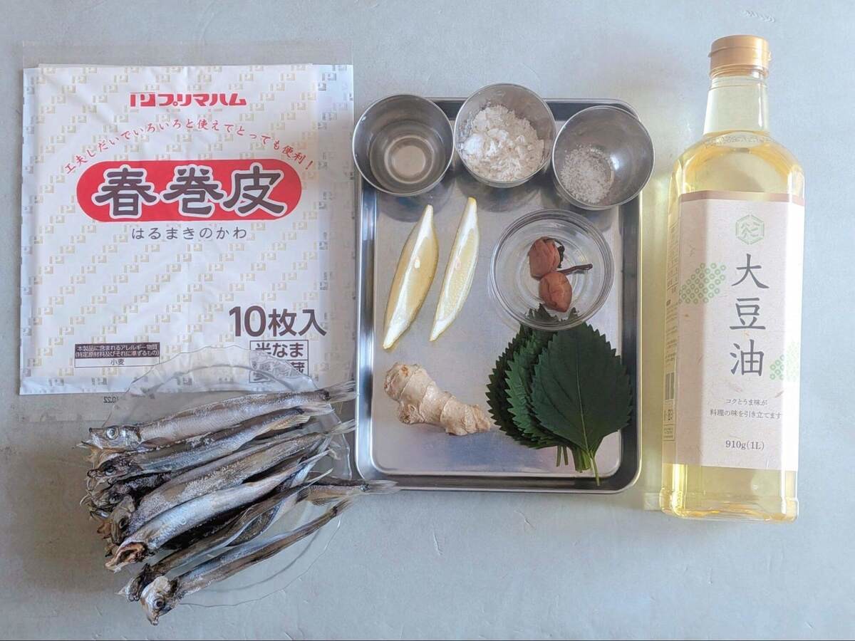 春巻きの皮に青じそ、梅干し、ししゃも、しょうがを置きます。