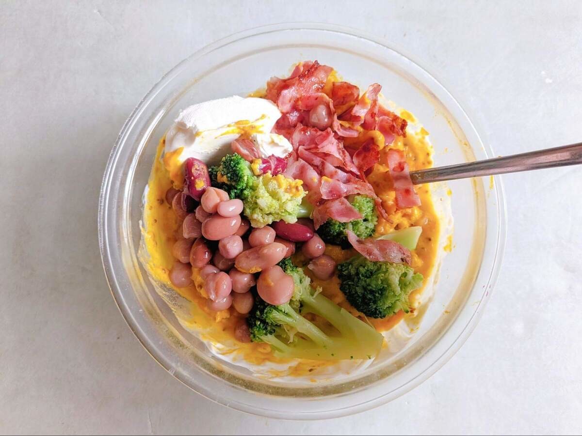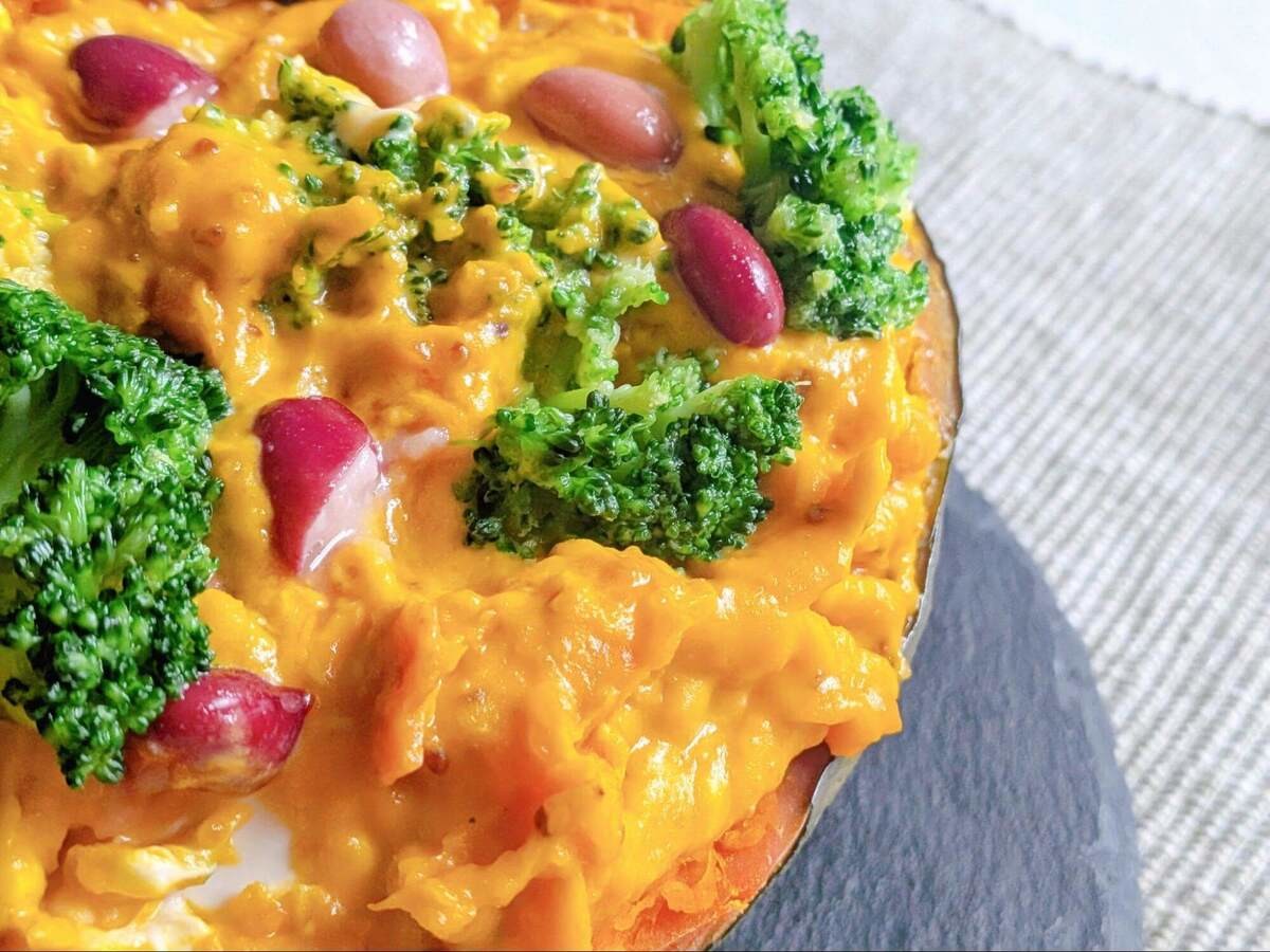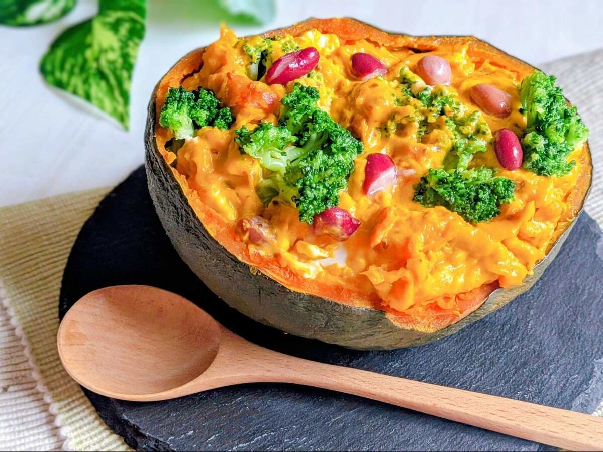 ②にベーコンとブロッコリー、クリームチーズ、ミックスビーンズを入れて軽く混ぜ合わせ、かぼちゃの皮に詰めたらできあがり。