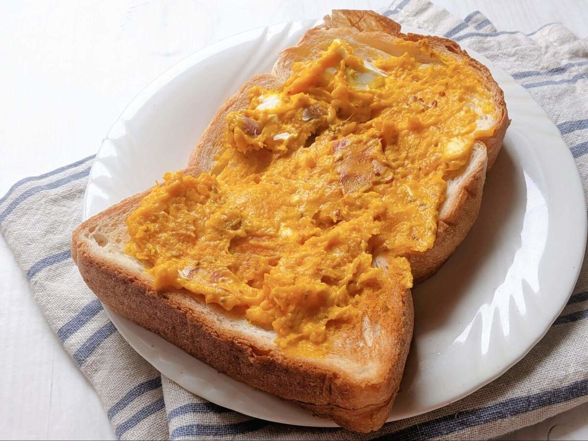 翌日、余ったサラダをトーストに塗ってみると、ボリューム満点の朝ご飯。