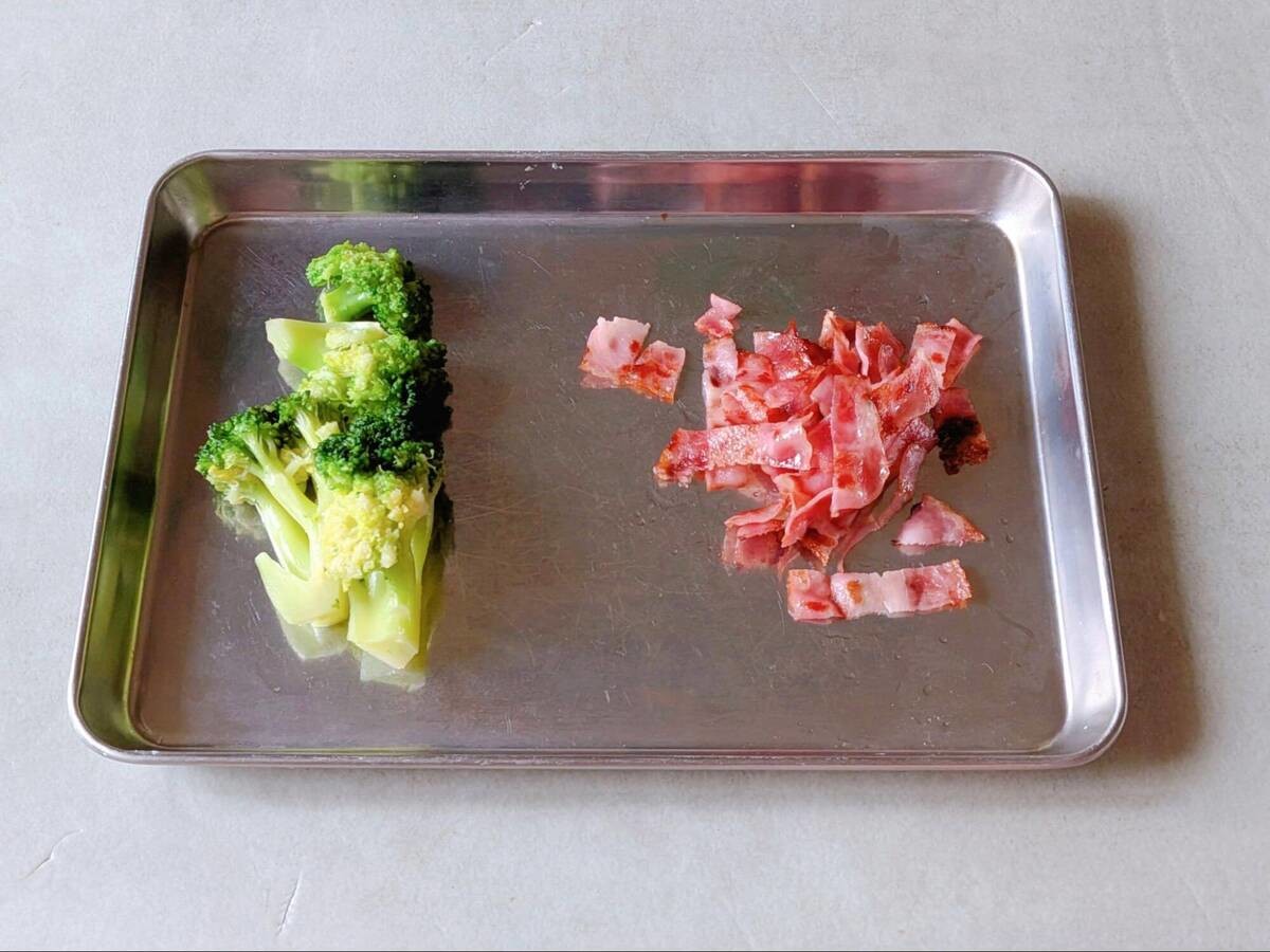 ベーコンはオーブントースターでカリカリに焼いたあと、短冊切りにしましょう。