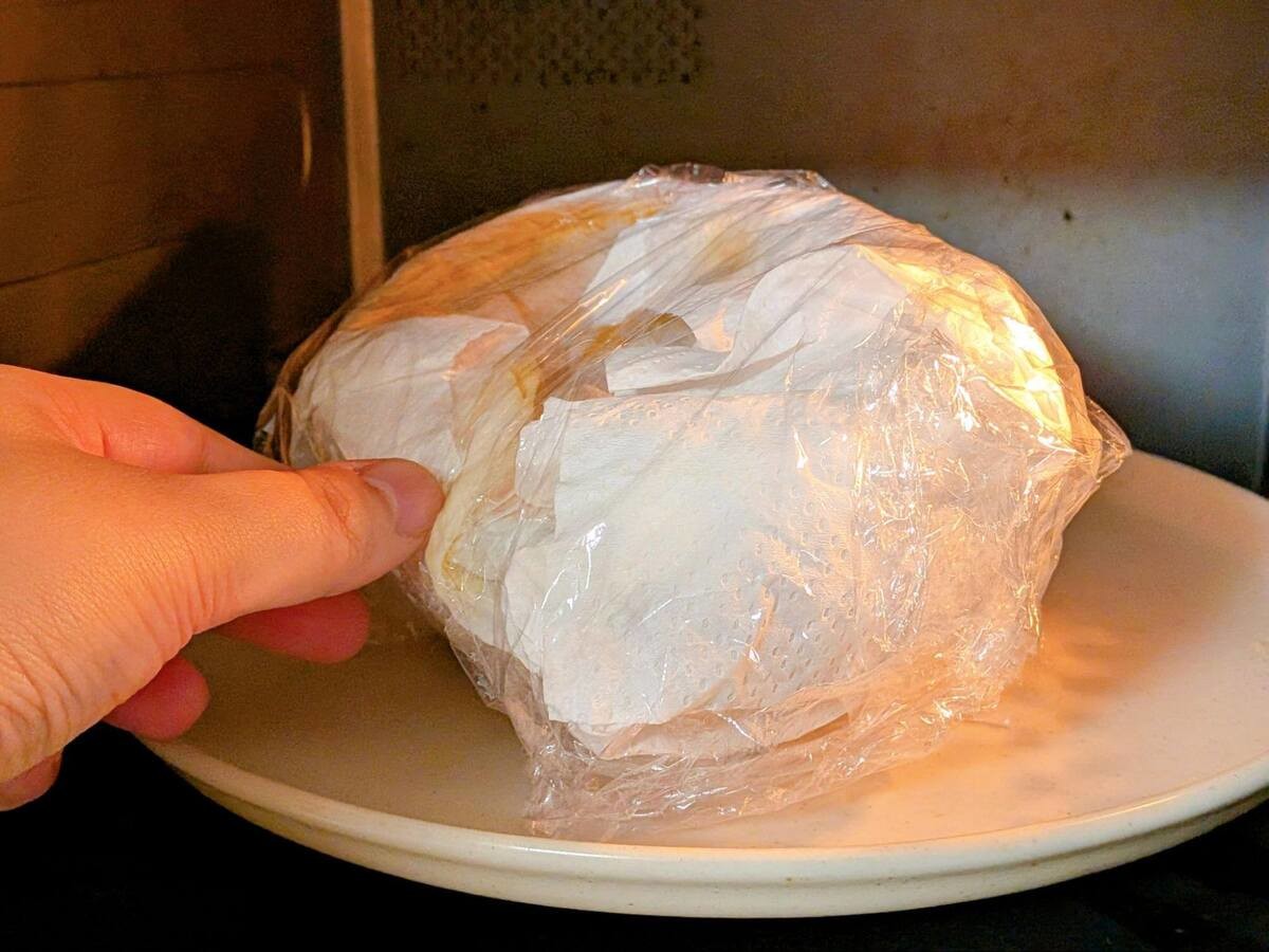 さらにラップでふんわり包んだら、電子レンジ(600W)で約10分加熱しましょう。加熱時間は、様子をみながら調節してくださいね。