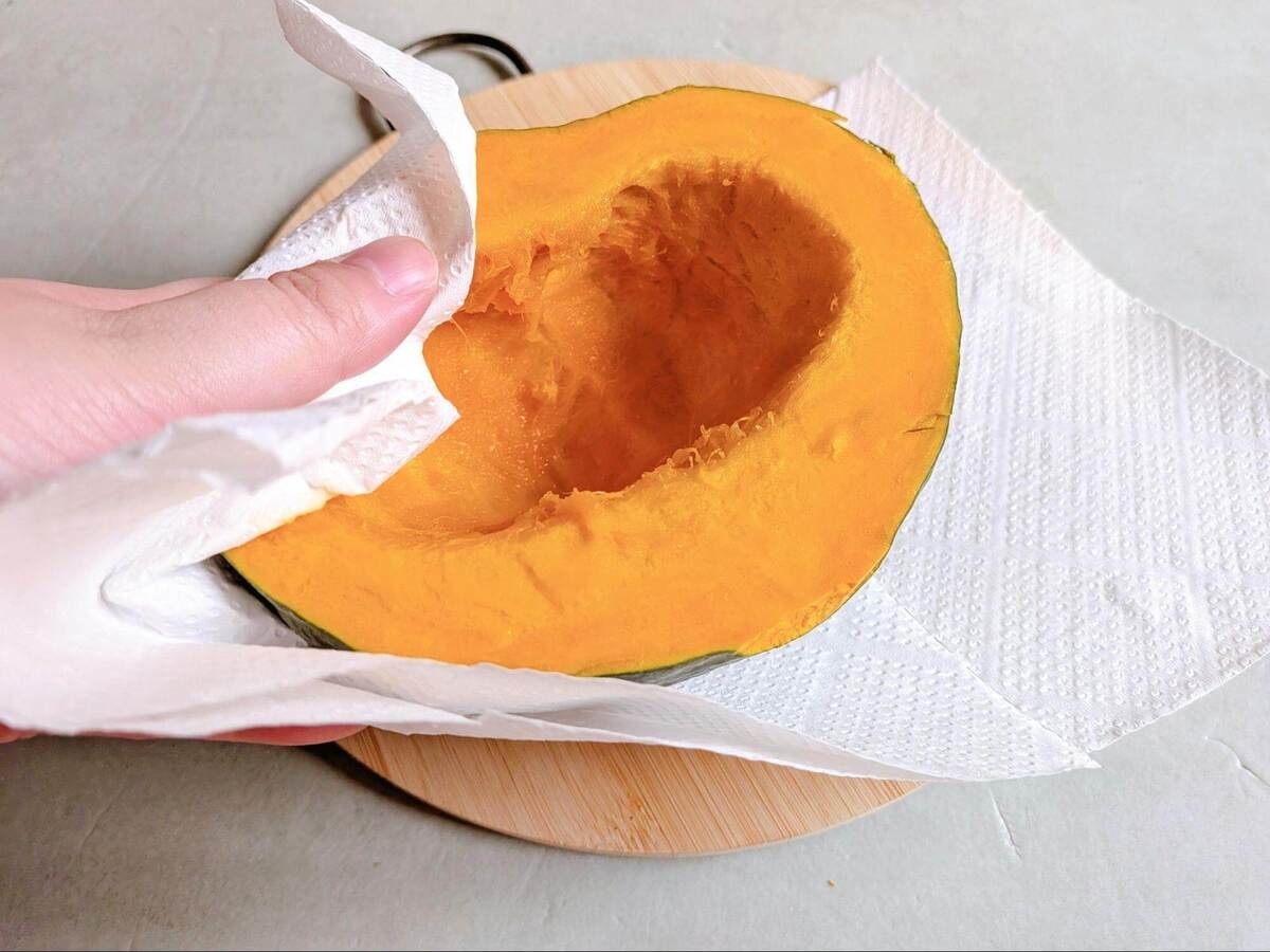 かぼちゃはワタと種を取ってさっと洗い、乾いたクッキングペーパーで包みます。