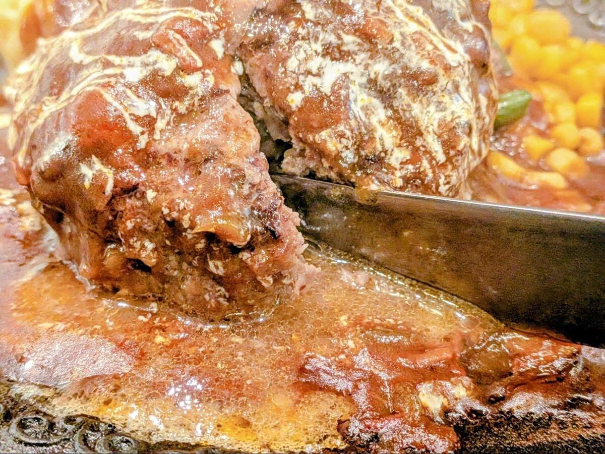 ハンバーグにそっとナイフを入れたそばから、肉汁がジュワ~~~ッ!誇張ではなく、本当にあふれるように出てきます。