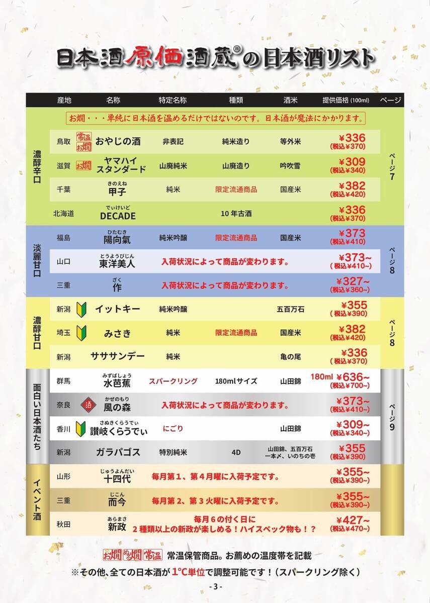 お客様に「日本酒」をよりお楽しみいただきたい、そんな気持ちから始めた「原価」提供です。日本酒は、300円台より提供しております。