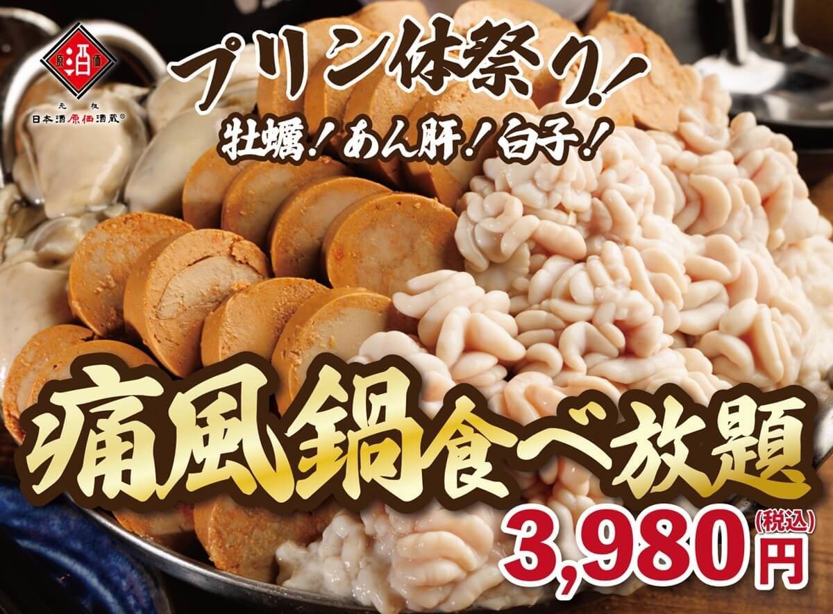 日本酒原価酒蔵全店、海鮮個室居酒屋 二ノ宮で『痛風鍋120分食べ放題』を税込3,980円で開催します。ここでは、その概要をご紹介しています。
