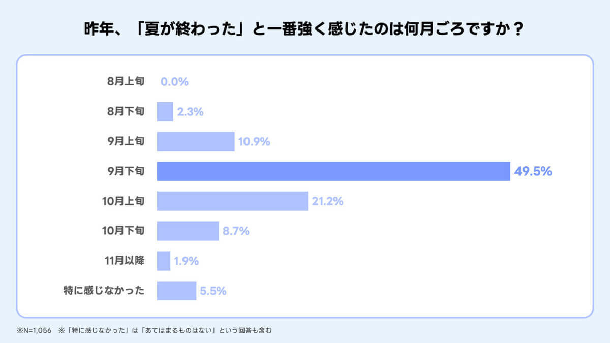 昨年の「夏の終わり」を感じた時期については、約半数が「9月下旬」と回答。さらに「10月上旬」と答えた人も2割を超えており、夏の終わりがじわじわと後ろにずれている傾向が見えてきました。