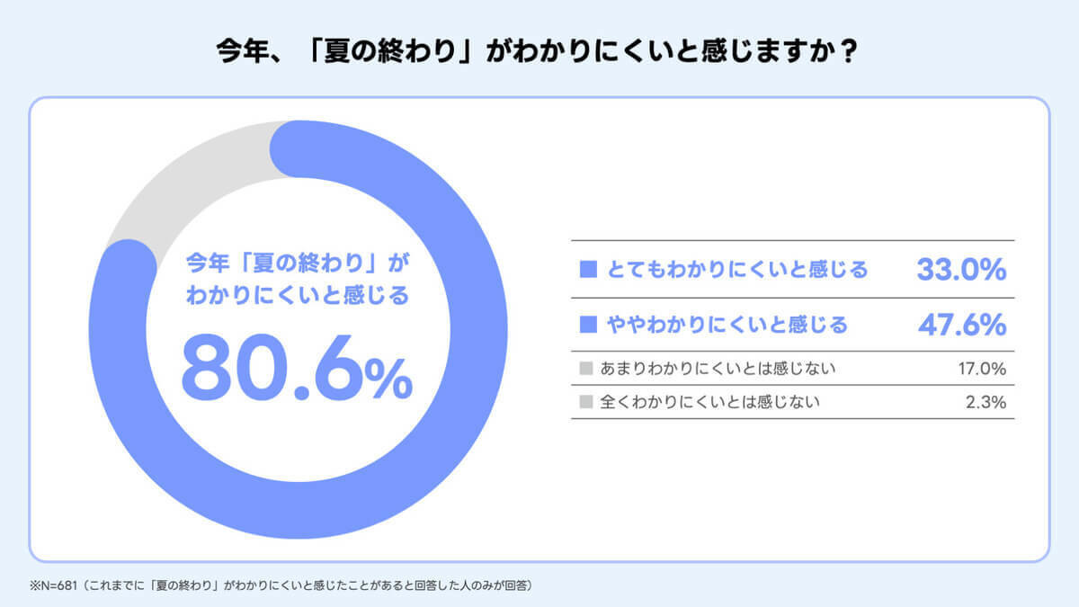 また、今年の「夏の終わりがわかりにくい」と感じる人は約80%という結果も。