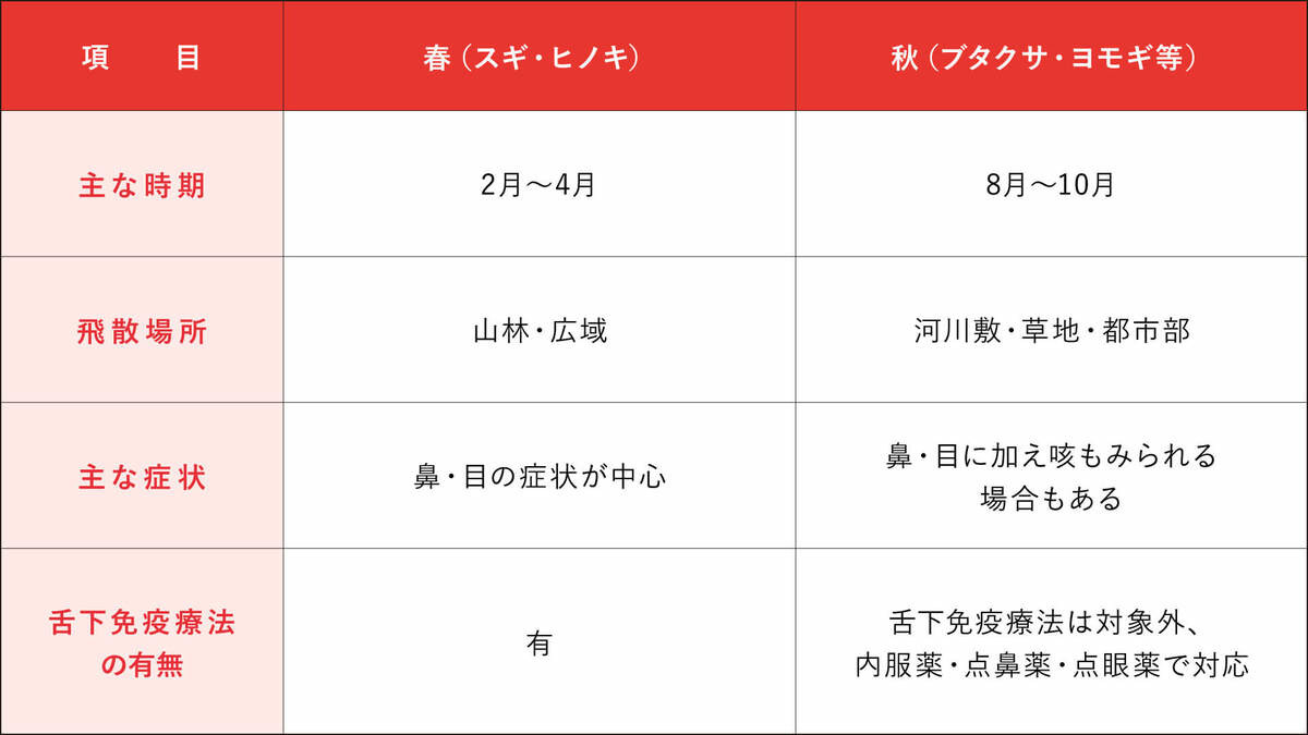 舌下免疫はスギやダニに特化した治療です。秋花粉症には効果がないため、治療は薬の服用、セルフケアでの対策が中心です。
