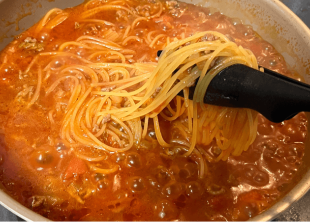 ソースにパスタを浸したらフタをして、袋に書かれている時間通りに煮込みましょう!