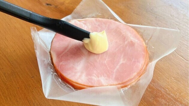 その上に、マヨネーズを塗ったハムを……