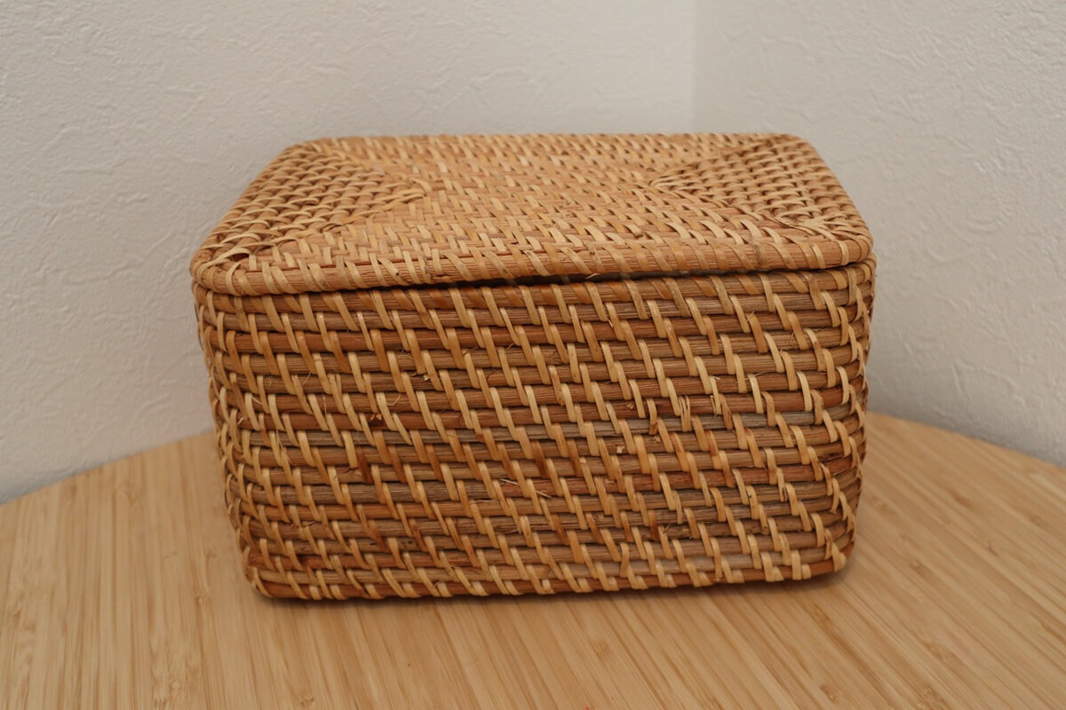 次に紹介するのは、ラタンのおしゃれなバスケットです。サイズ展開も豊富で、蓋もついているので、おしゃれなだけでなく、収納グッズとしても優秀です。
