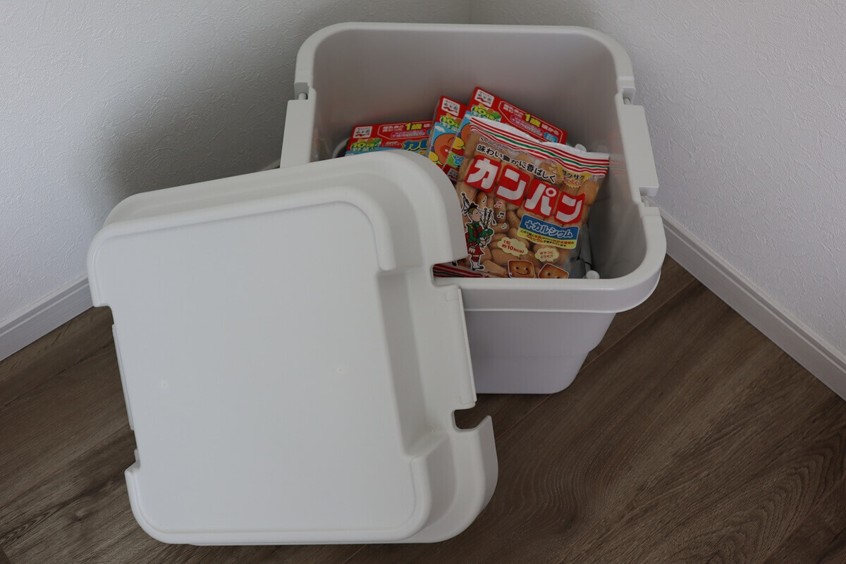我が家でも、災害ボックスとして使用していて、お菓子のローリングストック分もこの中に保管しています。
