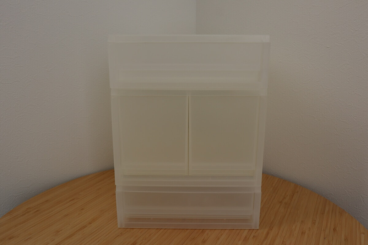 私は、上の写真のように、上と下は高さ9㎝のもの、真ん中は高さ17.5㎝で引き出しが2個のタイプのものを組み合わせて使っています。リビングにも脱衣所にも近いクローゼットの中に設置し、パッと取れると便利な子どもの衛生用品や、私の化粧品、アクセサリーを収納しています。