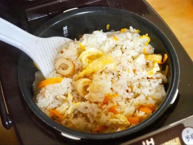 調味料と炒めた具材を炊飯器に入れたら、通常モードで炊飯します。いつも通りご飯が炊き上がるのを待っていれば、「至高のちくわ炊き込みご飯」の完成です。