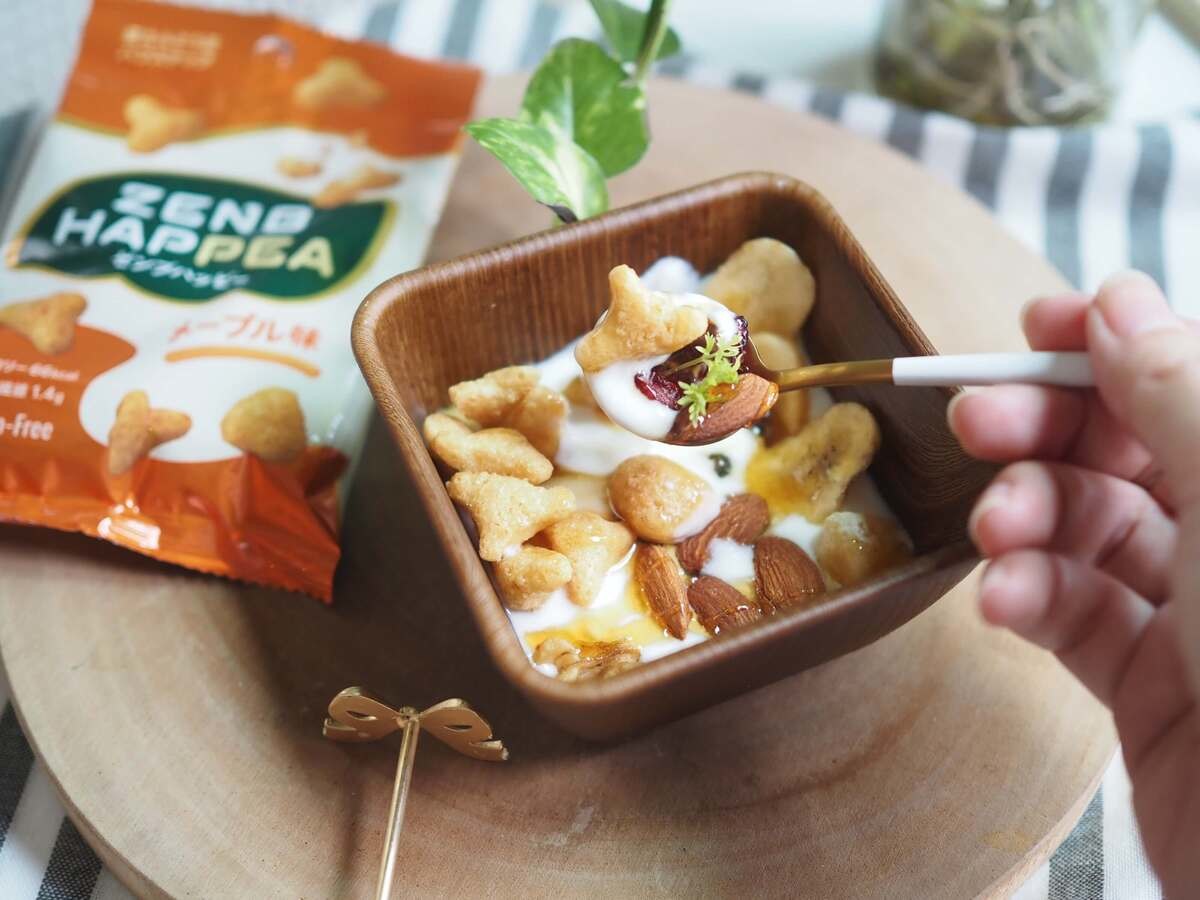 「食べてすぐ、これはシリアルとしても楽しめるのでは……?と早速トライ。ゼンブハッピー自体に甘みがあるので、ノンシュガーヨーグルトと相性抜群!メープル味とアーモンド・ドライフルーツなどをのせて健康的なシリアルボウルにしても食べ応え満点。」