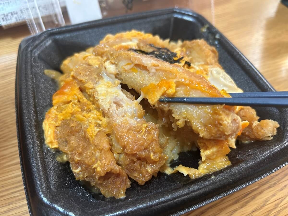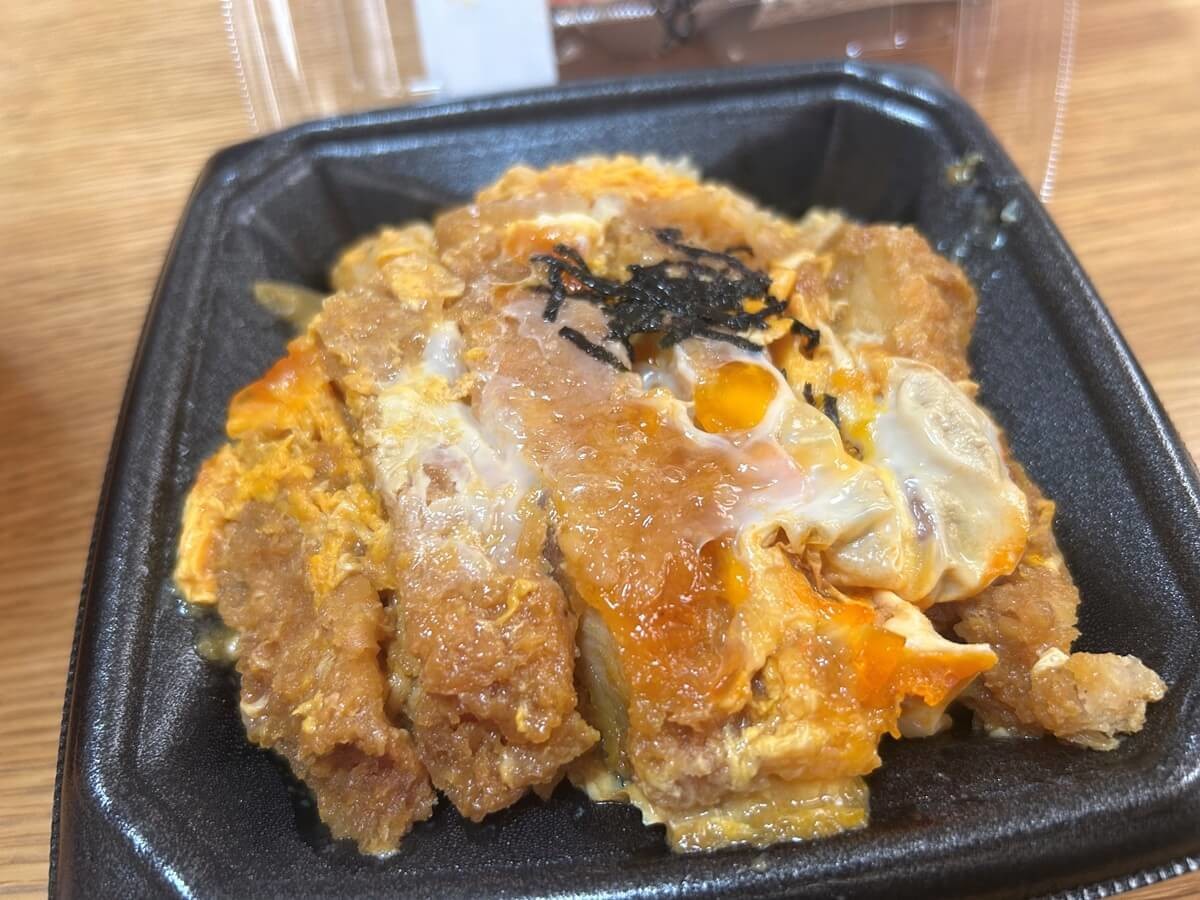 甘めの味付けで、玉子がとろーり、そして大きなとんかつが上に「ドン」とのっています。ご飯までつゆがしみしみの食べ応え十分・コスパ最高のお弁当です。