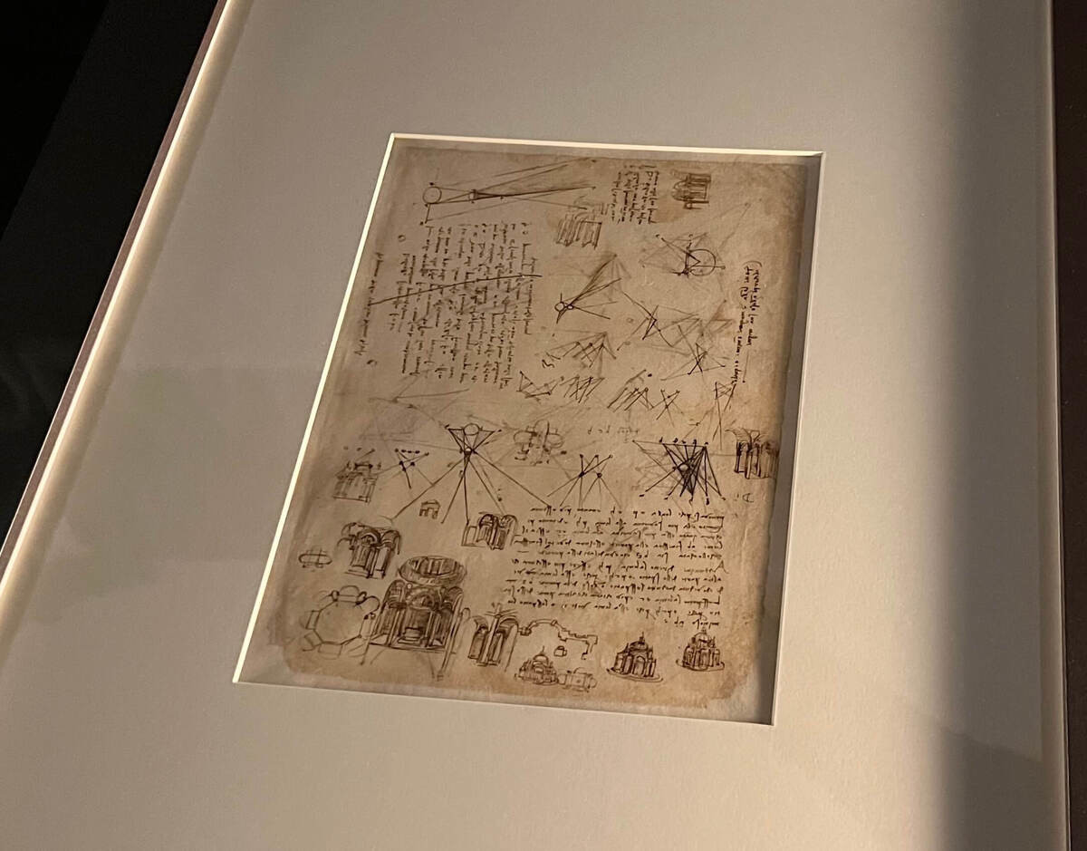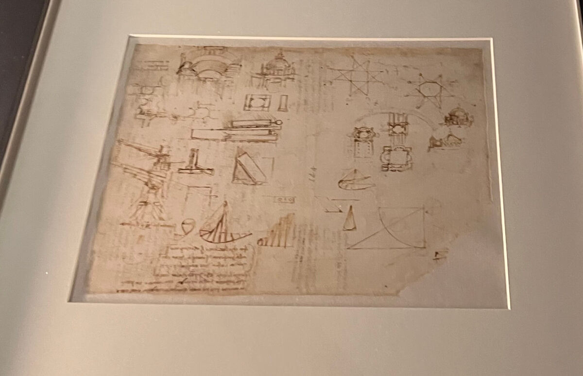 「アトランティックコード」というのは、レオナルドが残した1,119枚のシートからなるコレクション。科学(解剖学、物理学)、技術(機械、飛行装置)、芸術(スケッチ)、建築(都市計画)など、幅広い分野のメモや素描が含まれています。1637年以来、図書館が大切に所蔵してきた宝物です。通常は厳重に保管されているため、これほど間近で見られる機会は極めて稀なんだとか。