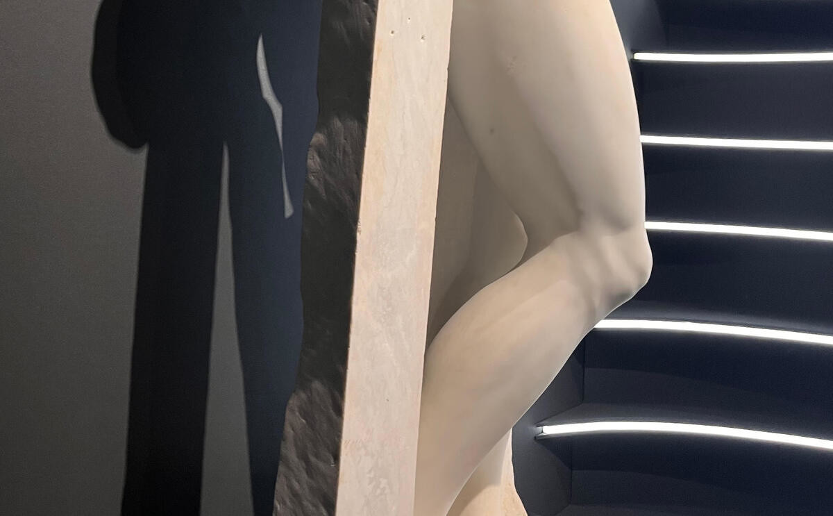 天然の大理石ゆえに彫るまではわからなかった黒い筋が顔に当たってしまったため、ミケランジェロは制作途中で放棄。顔をよく見ると、まるで涙を流しているかのように、黒い筋があるのがわかります。