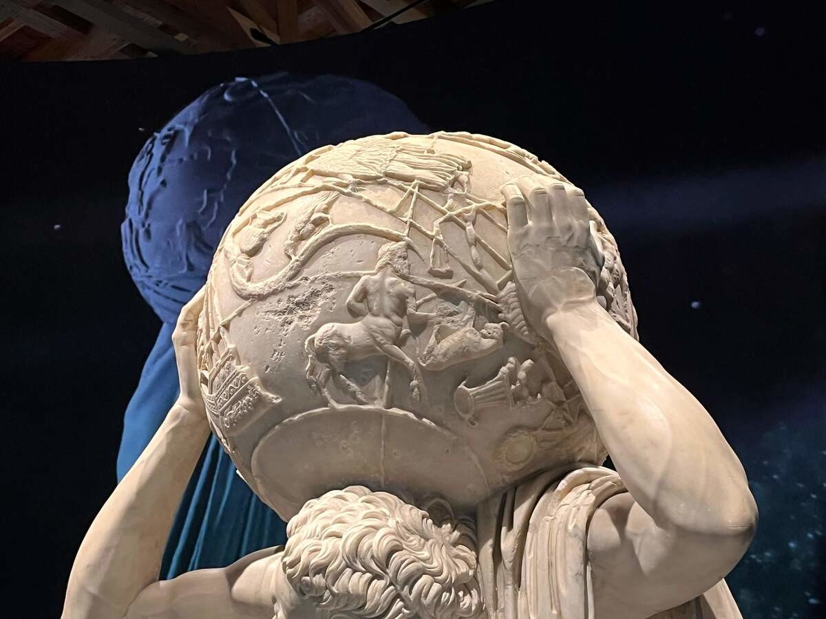 実はこの作品、アート作品としてだけでなく、科学的にも超重要。アトラスが支える球体は地球と思いがちですが、実は宇宙そのもの。6mmの浅浮き彫りで星座や四方位、天と地が精巧に彫られています。これが古代においてもっとも正確な星座の表現の一つとされていて、何世紀にもわたって天文科学に影響を与えてきたのだそう。