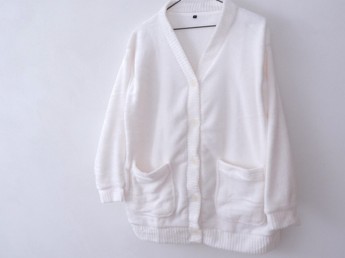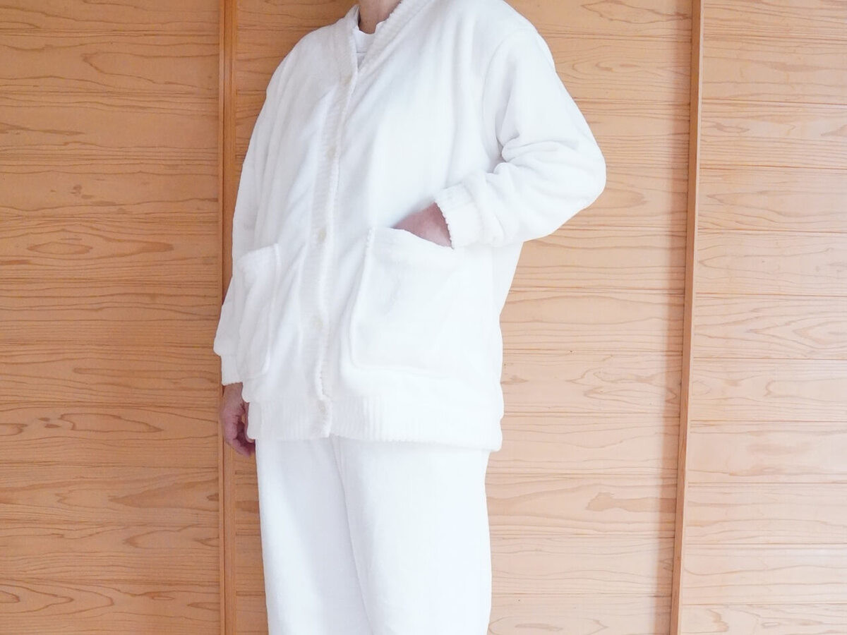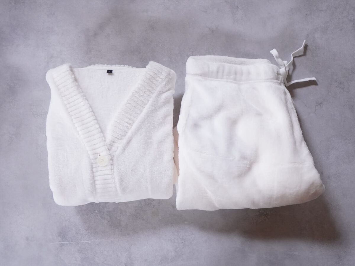 上はカーディガンタイプ。分厚すぎずゴワゴワしないので、家事もラクにできちゃいます。
